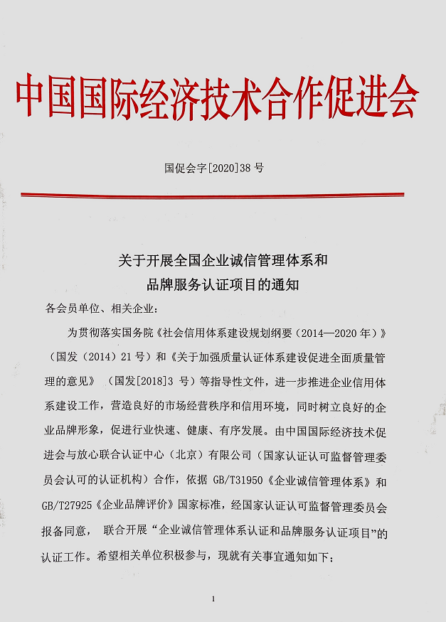 关于开展全国企业诚信管理体系和品牌服务认证项目的通知